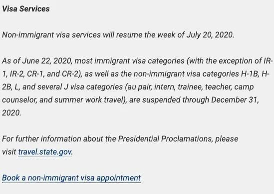 2、7月12日,美国国务院领事事务局的官方推特上,一条回复网友的推特表示从7月15日开始,美国使领馆可能根据当地情况分阶段恢复常规签证服务。对比此前官方推特的回答,充分说明美国签证业务要在7月15号后开始恢复了!