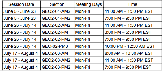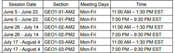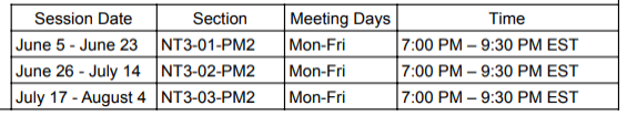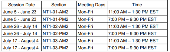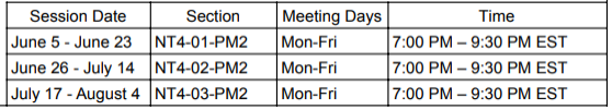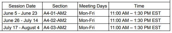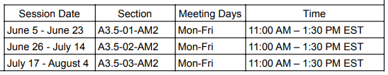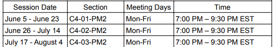 被我们的暑期课程录取的学生决定他们想参加的时间以及他们想在每个课程中注册多少门课程。学生可以报名参加一个或多个课程,并且在一个课程中没有最低或最高课程数限制。上课模式如下: