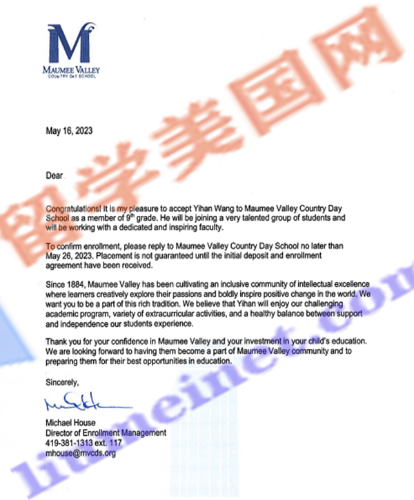 留美网喜报频传:恭喜留美网W同学斩获莫米谷中学Maumee Valley Country Day School的录取offer!