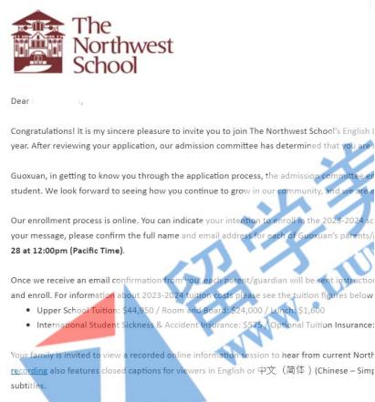 西北中学的升学率在华盛顿州排名前4,每年有近2/3的学生升入美国前百名校,包括哈佛、耶鲁、哥伦比亚、斯坦佛、芝加哥、西北大学、宾州州立大学、波士顿大学、纽约大学等TOP100的美国名校.