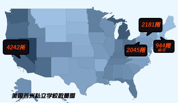 高性价比的高中的标准 美国私立高中非常多,仅仅一个加州就有4000多所私立学校(如右图),选 校是一项“大工程”,找到一所性价比很高的学校是很多家长的诉求。那么什么样的学校算是“性价比”很高的学校呢?下面是留学美国网为朋友们推荐高性价比高中的几点标准,供参考。