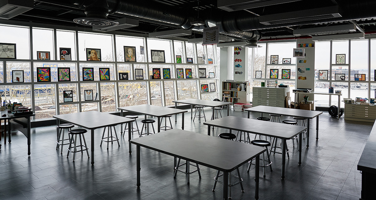学校建筑包括:45间教室、1体育馆、3间音乐教室、2间艺术房、1剧院、1间多用途客房,可欣赏纽约港和自由女神像的美景、丰富的户外空间,包括3个游乐场,有一个丛林体育馆和想象游乐场。